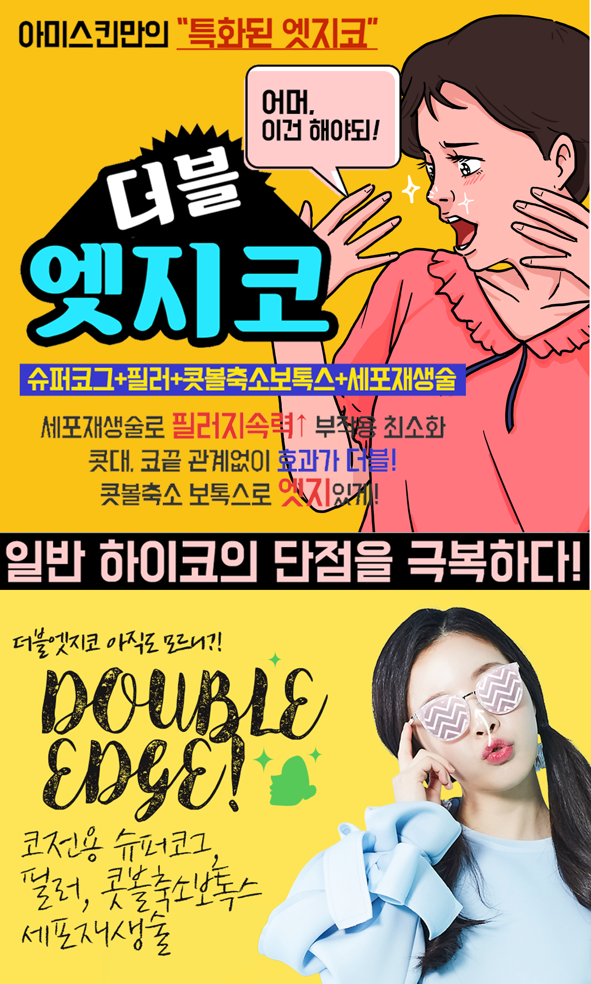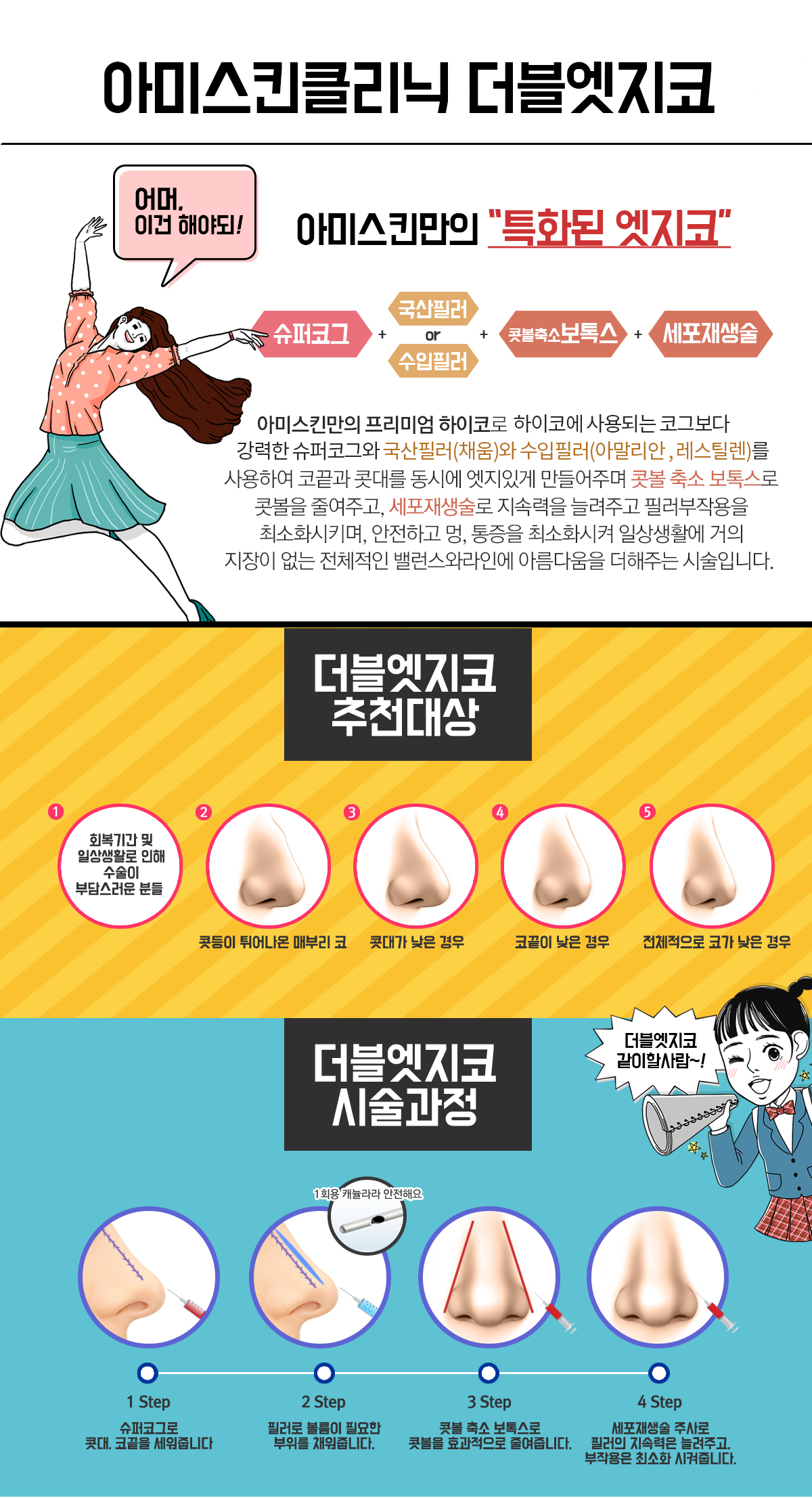 아미스킨만의 프리미엄 하이코로, 일반적으로 하이코에 사용되는 코그보다 더 강력한 슈퍼코그와 국산필러(채움) or 수입필러(아말리안)을 사용하여 코끝과 콧대를 동시에 엣지있게 만들어