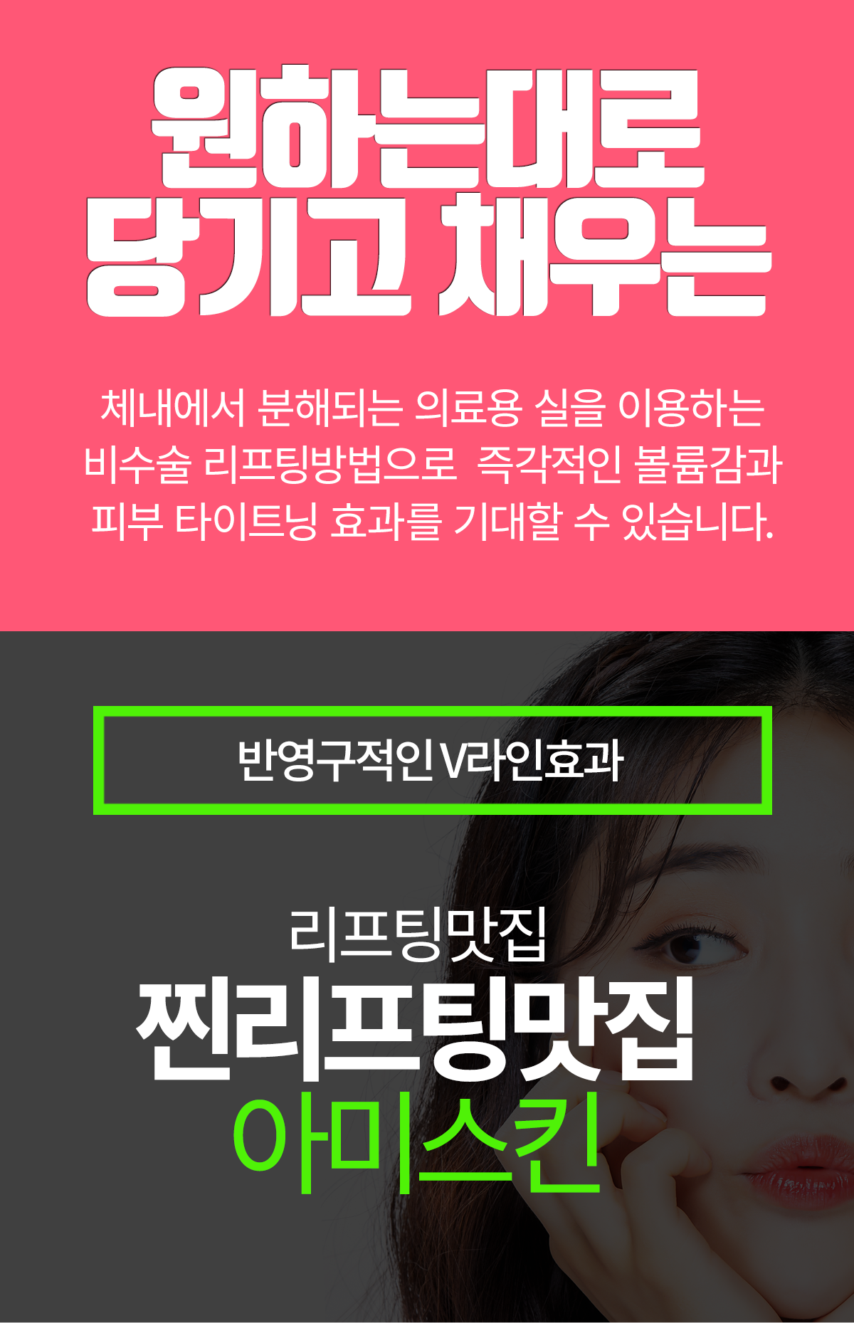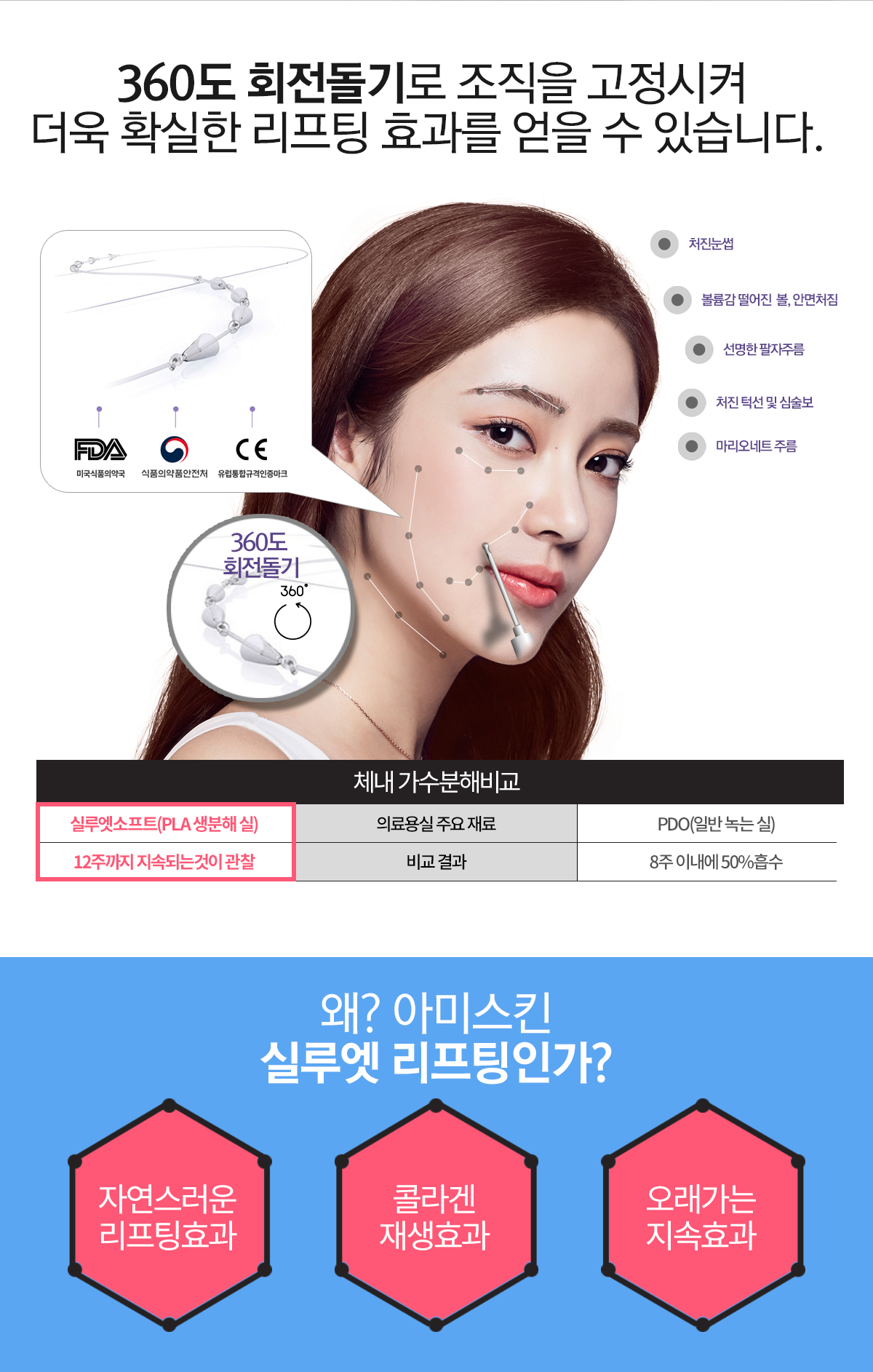 체내에서 분해되는 의료용 실을 이용하는 비수술 리프팅방법으로 즉각적인 볼륨감과 피부 타이트닝 효과를 기대