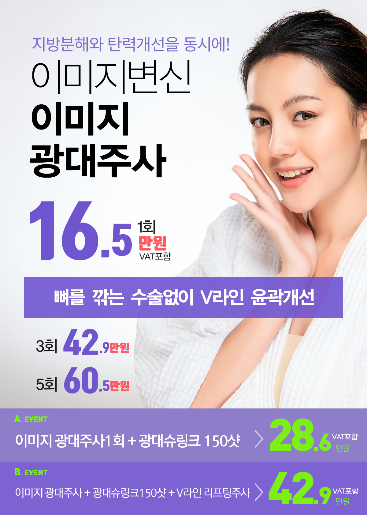 얼굴을 더욱 슬림하게 눈은 더 크게보이도록 하며, 광대라인을 부드럽게 하도록 고객님들의 의견을 충분히 반영하여 어떤각도에서 봐도 갸름한 달걀형얼굴을 고객님들께 선사합니다.