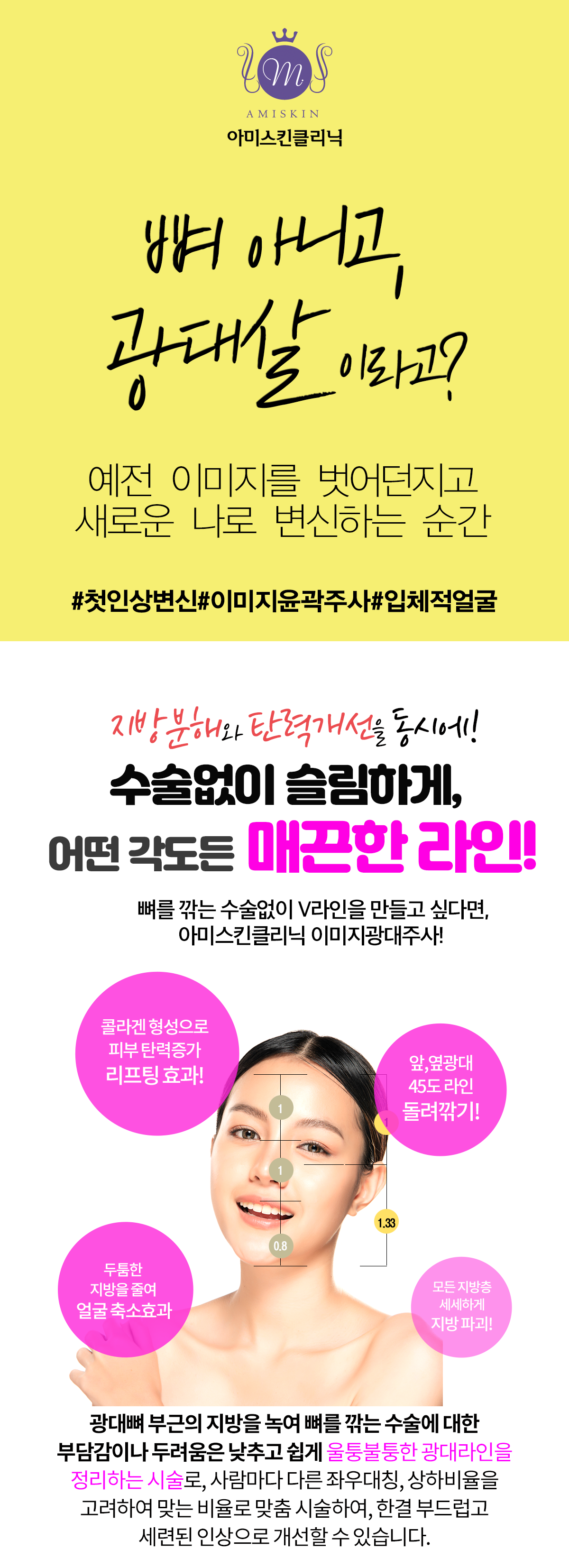 얼굴을 입체적이면서도 자연스럽게 느껴지도록 균형감있고 아름답게 만들어주는 아미스킨 만의 독자 시술입니다.