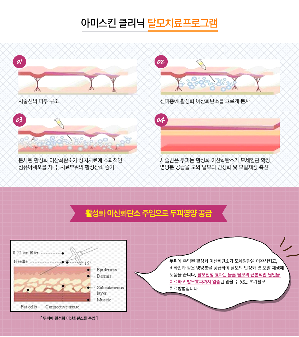 진피층에 활성화 이산화탄소를 공급하여 탈모의 안정화 및 모발재생을 촉진 하는 시술 입니다.
