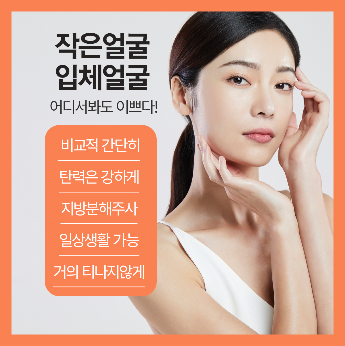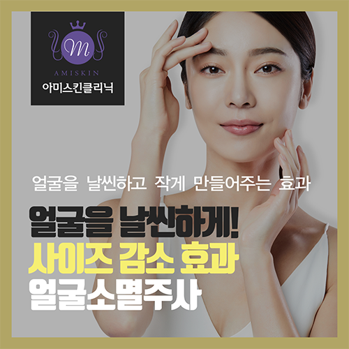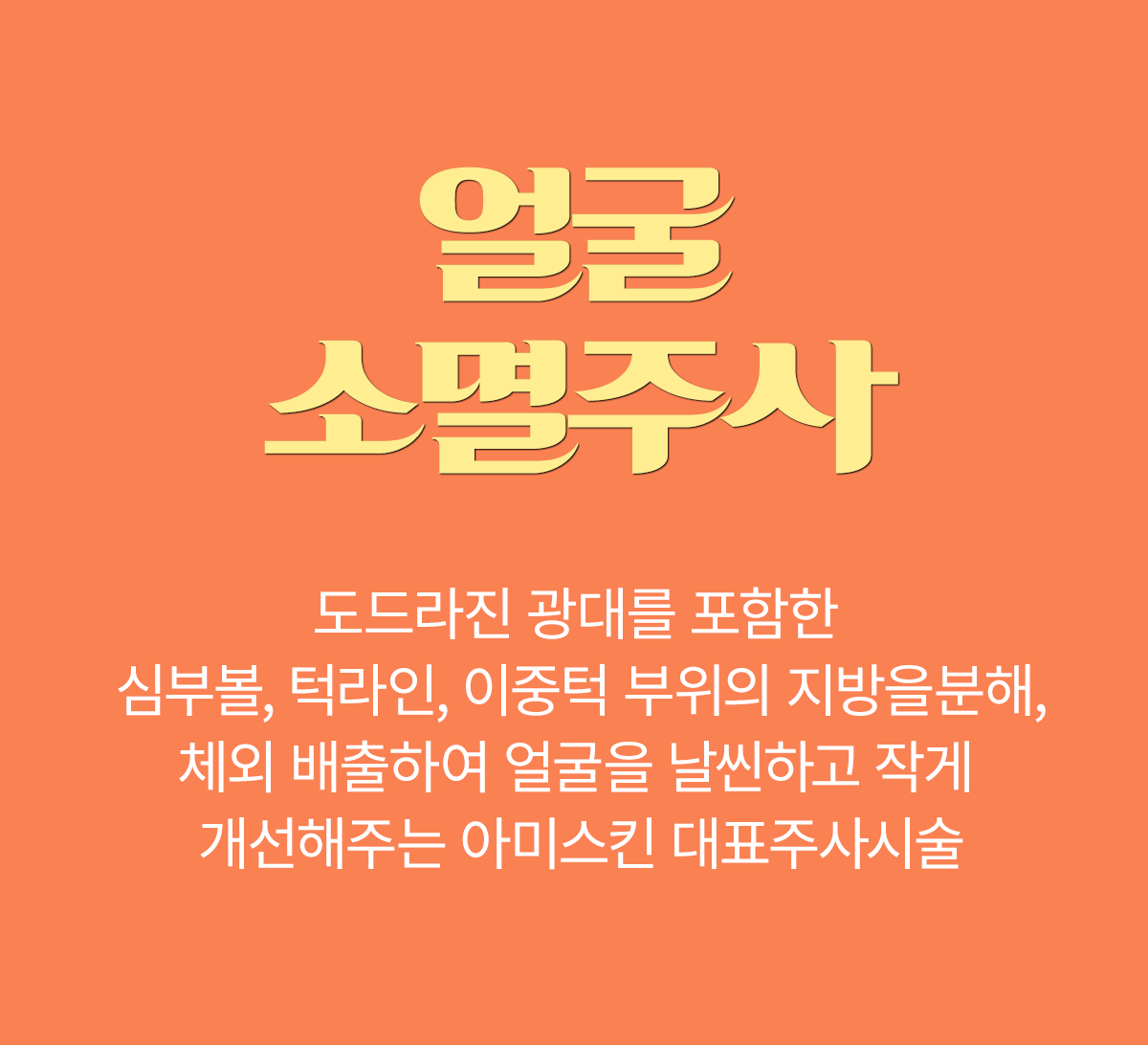 도드라진 광대를 포함한 심부볼, 턱라인, 이중턱 부위의 지방을분해, 체외 배출하여 얼굴을 날씬하고 작게 개선해주는 아미스킨 대표주사시술