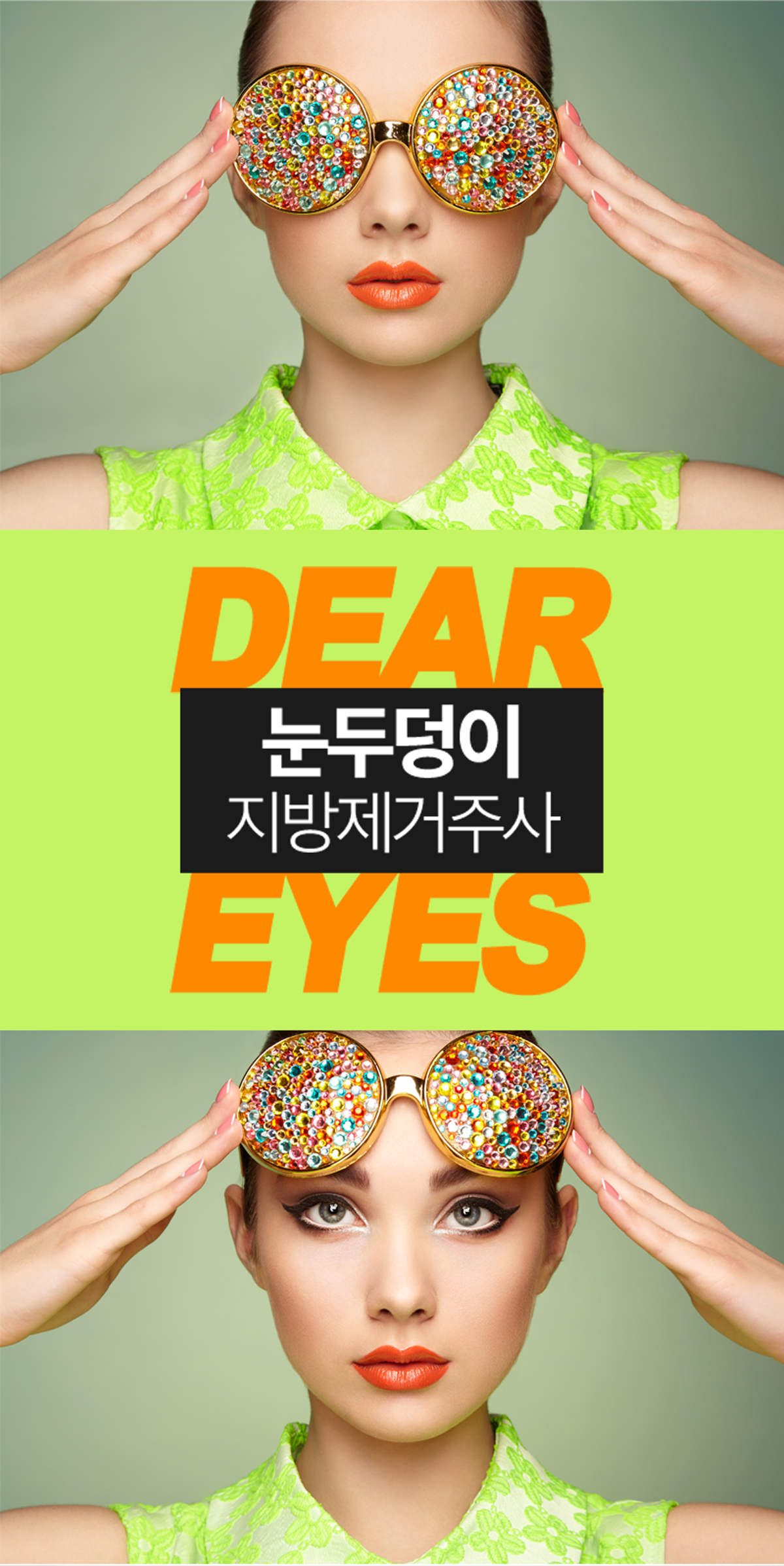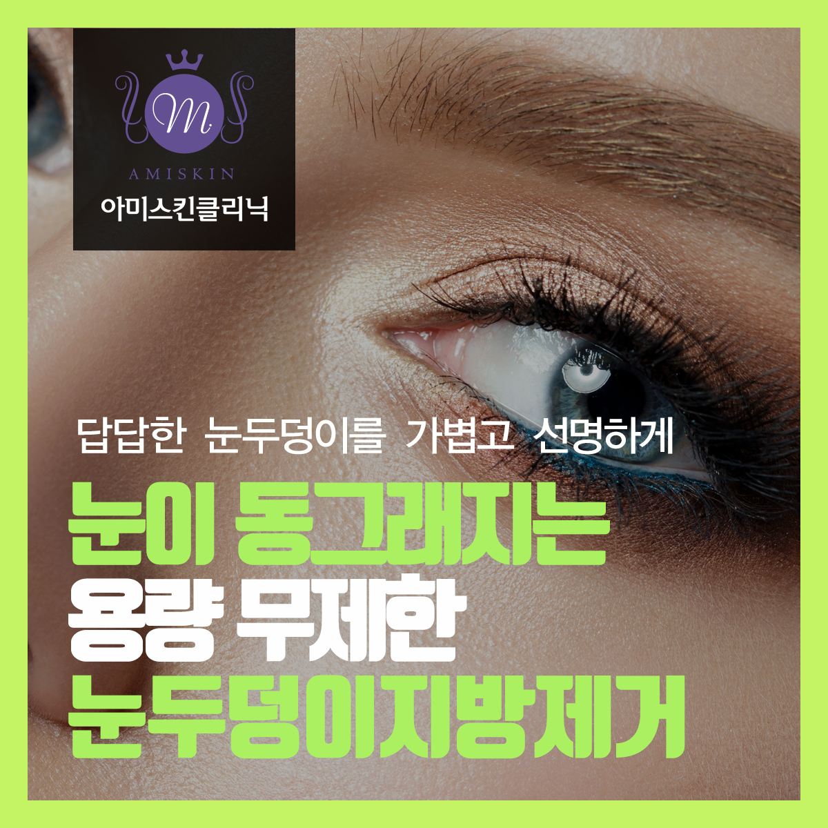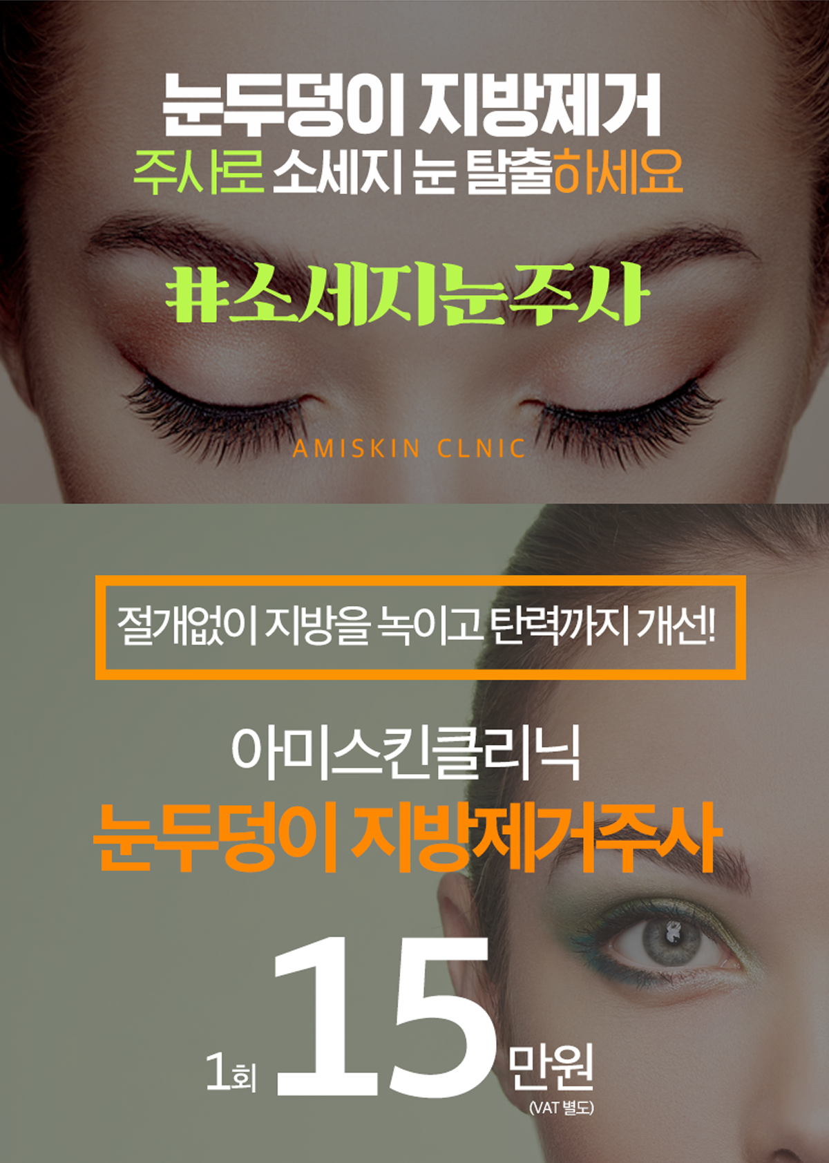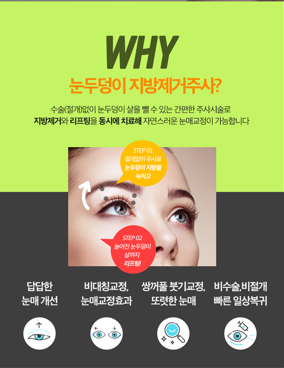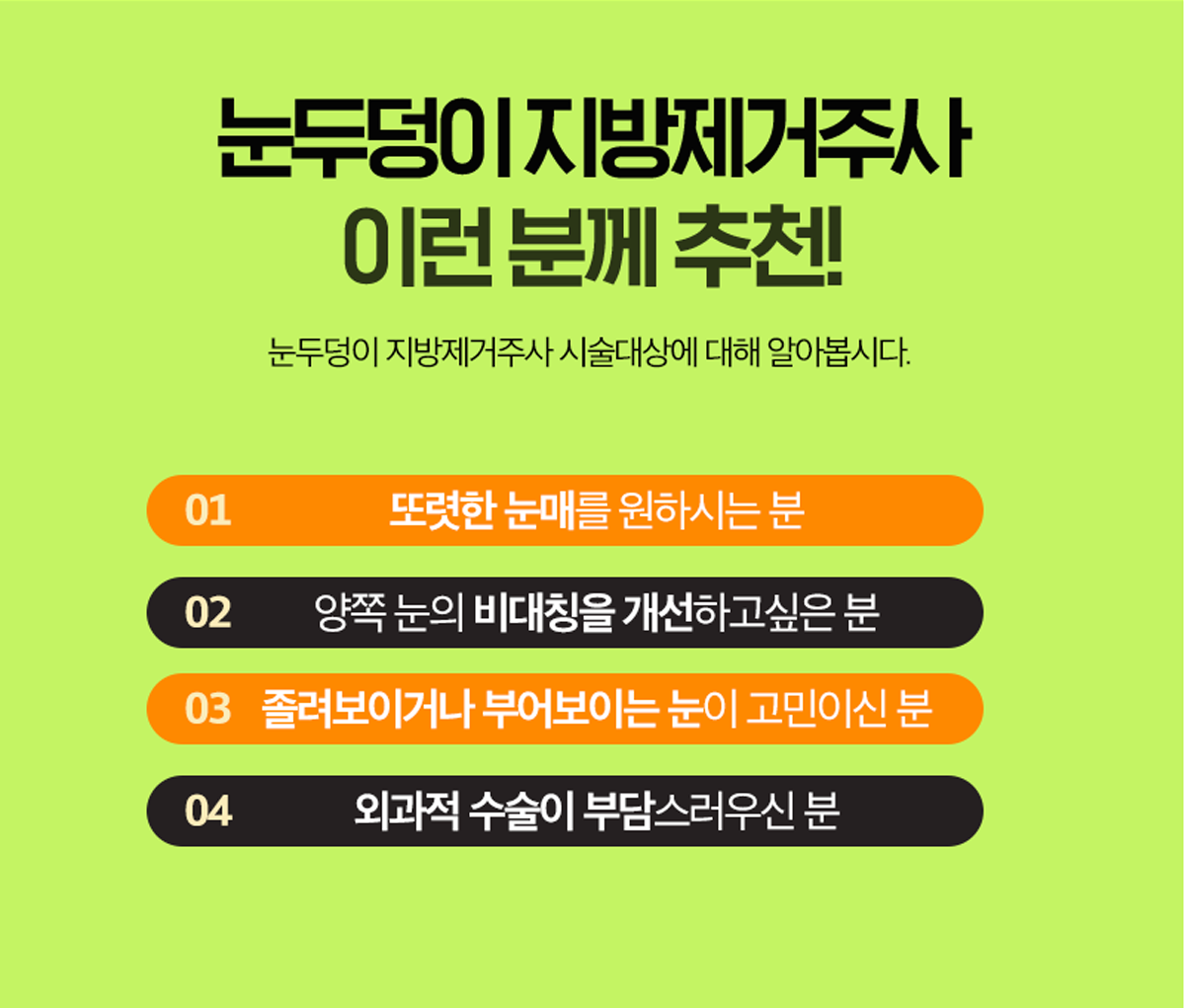 수술(절개)없이 눈두덩이 살을 뺄 수 있는 간편한 주사시술로 지방제거와 리프팅을 동시에 치료해 자연스러운 눈매교정이 가능합니다.