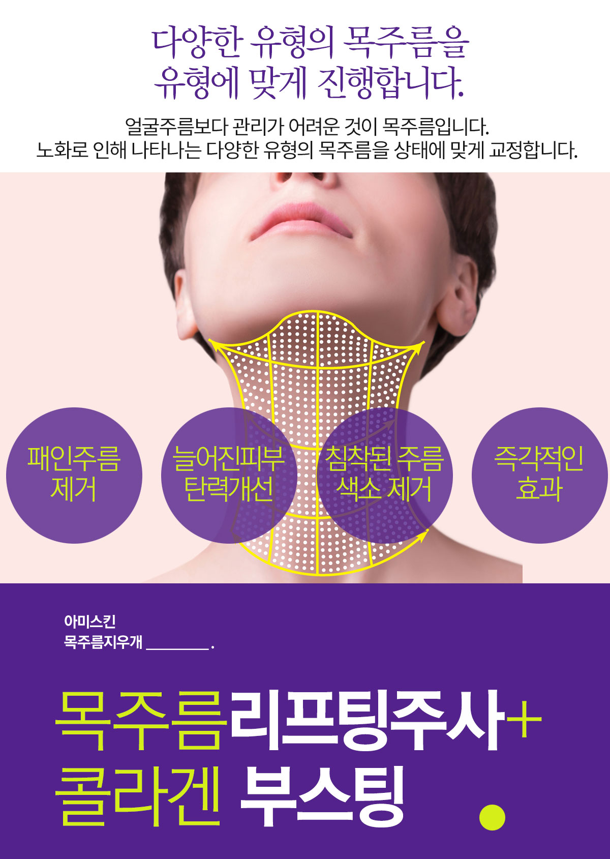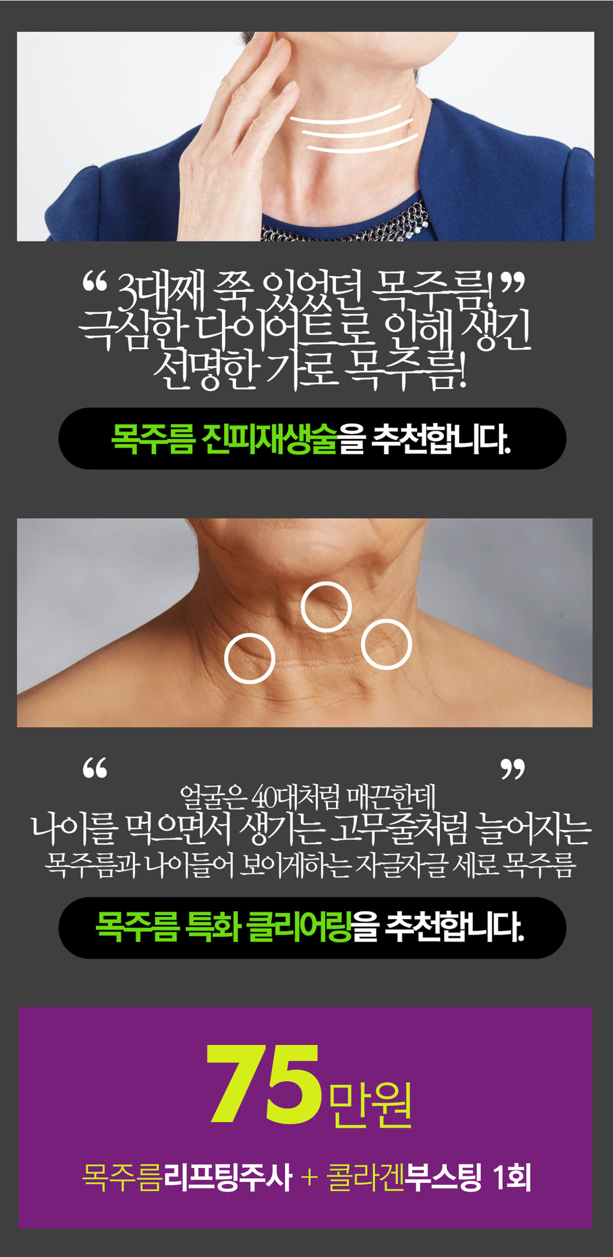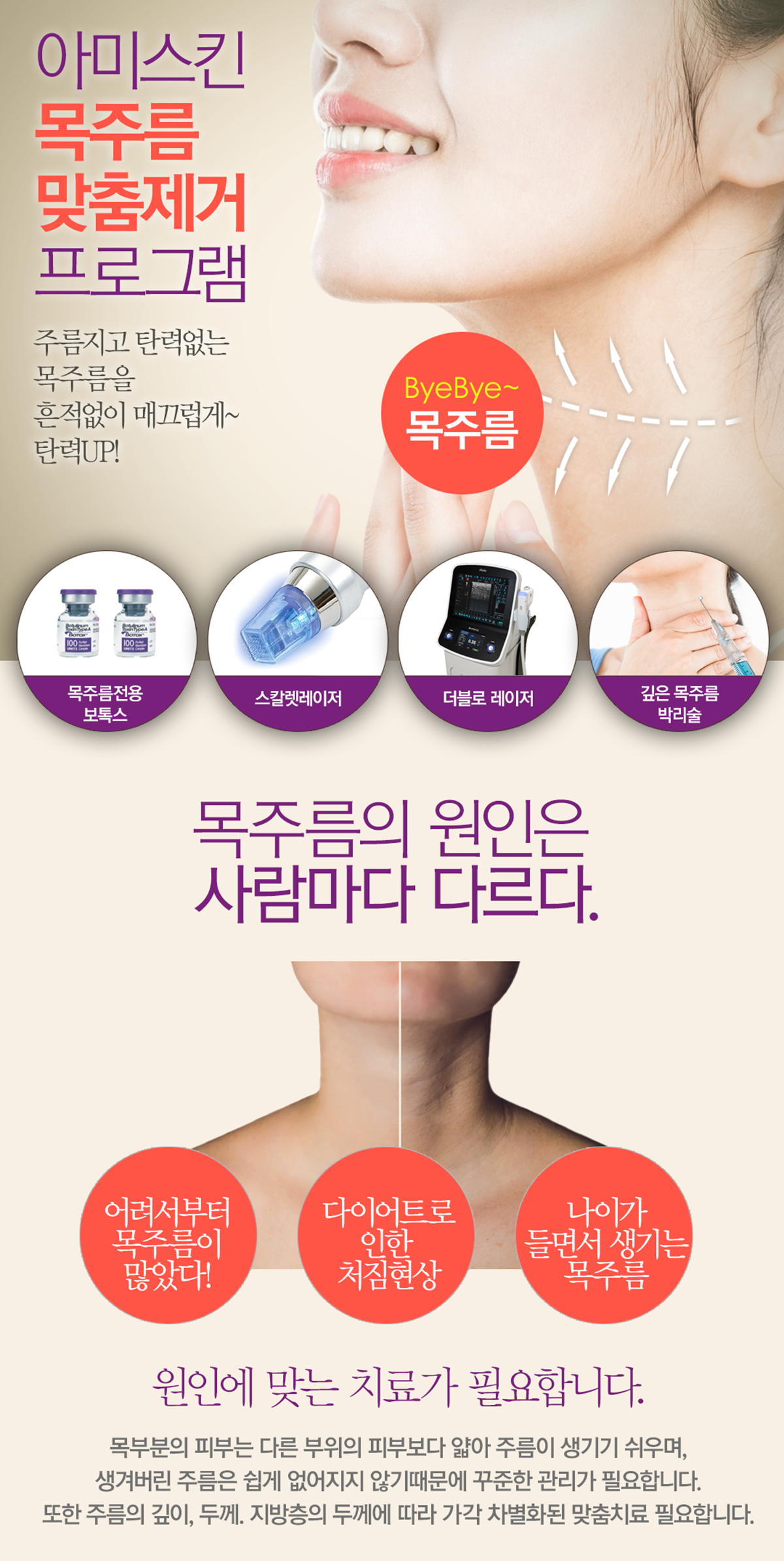 목은 직접적인 관절 부위이므로, 아주 쉽게 주름이 생깁니다. 나이가 들수록 자연히 근육과 피부층이 늘어나고 주름층이 복구되지 않는 상태로 발전하게 됩니다.