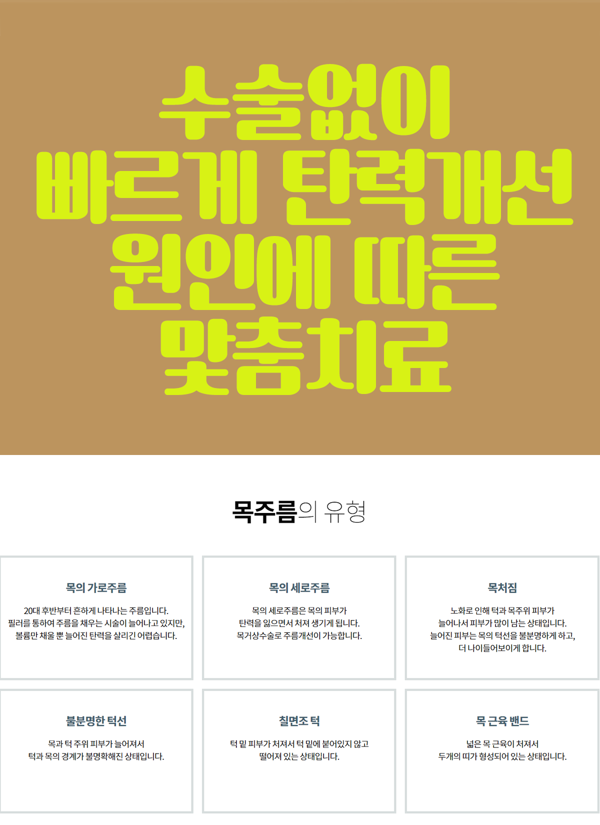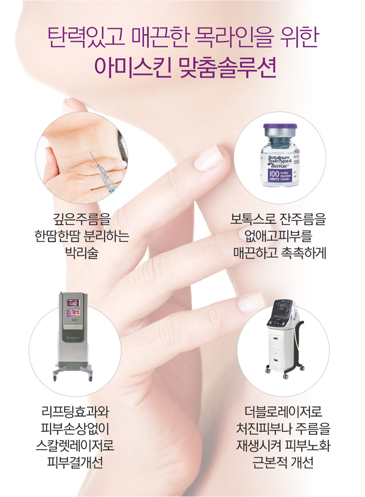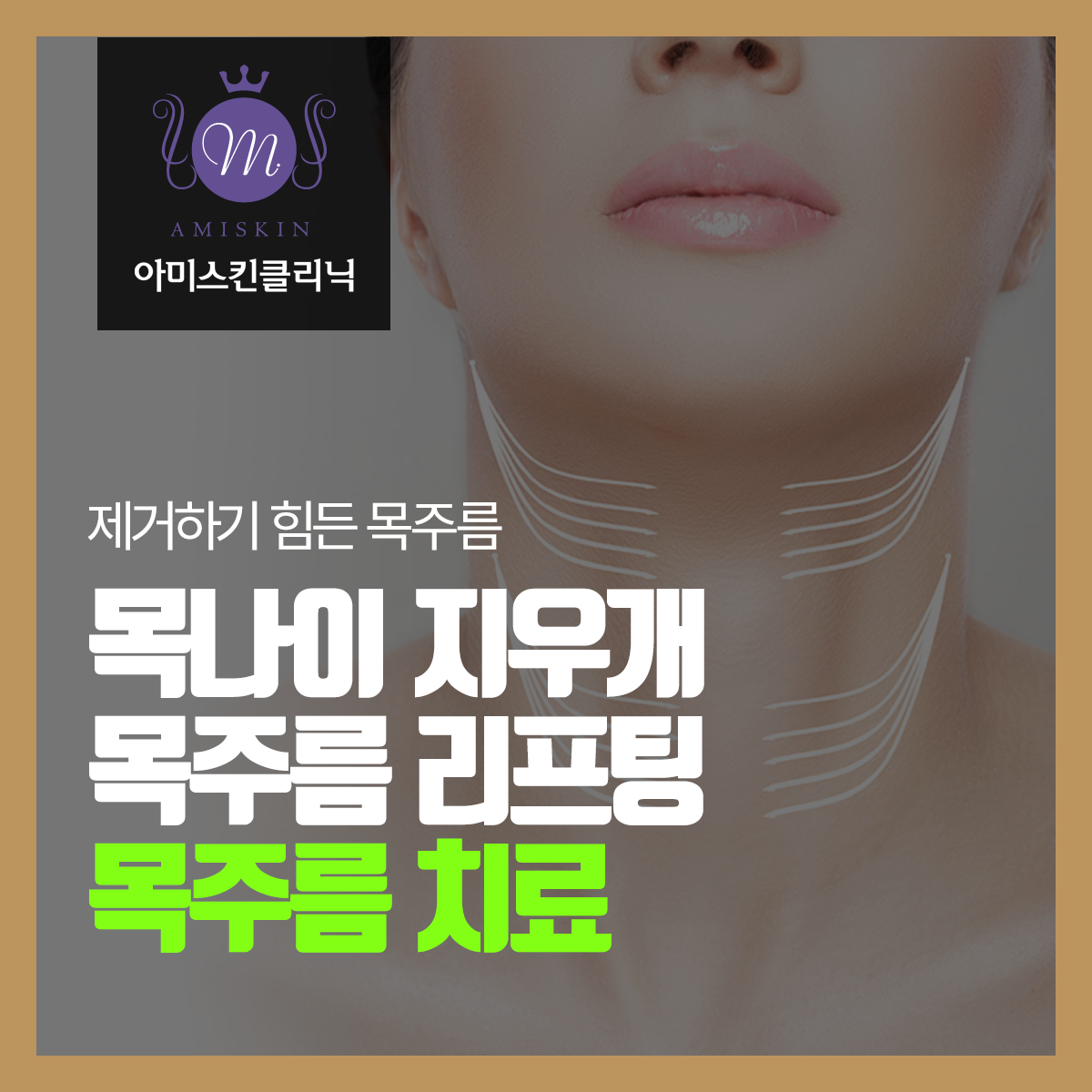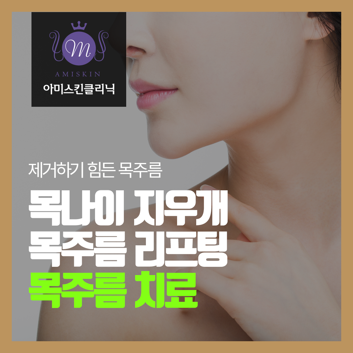 목은 직접적인 관절 부위이므로, 아주 쉽게 주름이 생깁니다. 나이가 들수록 자연히 근육과 피부층이 늘어나고 주름층이 복구되지 않는 상태로 발전하게 됩니다.
